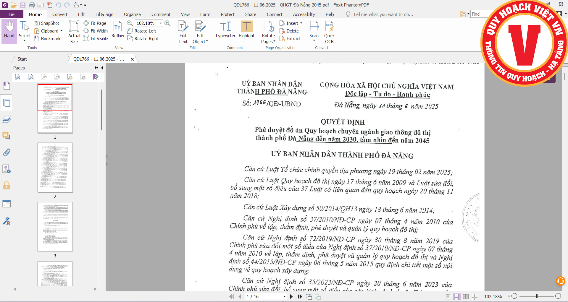 Ngày 11/06/2025. UBND thành phố Đà Nẵng vừa ban hành Quyết định số 1766/QĐ-UBND phê duyệt đồ án Quy hoạch chuyên ngành giao thông đô thị thành phố Đà Nẵng đến năm 2030, tầm nhìn đến năm 2045.